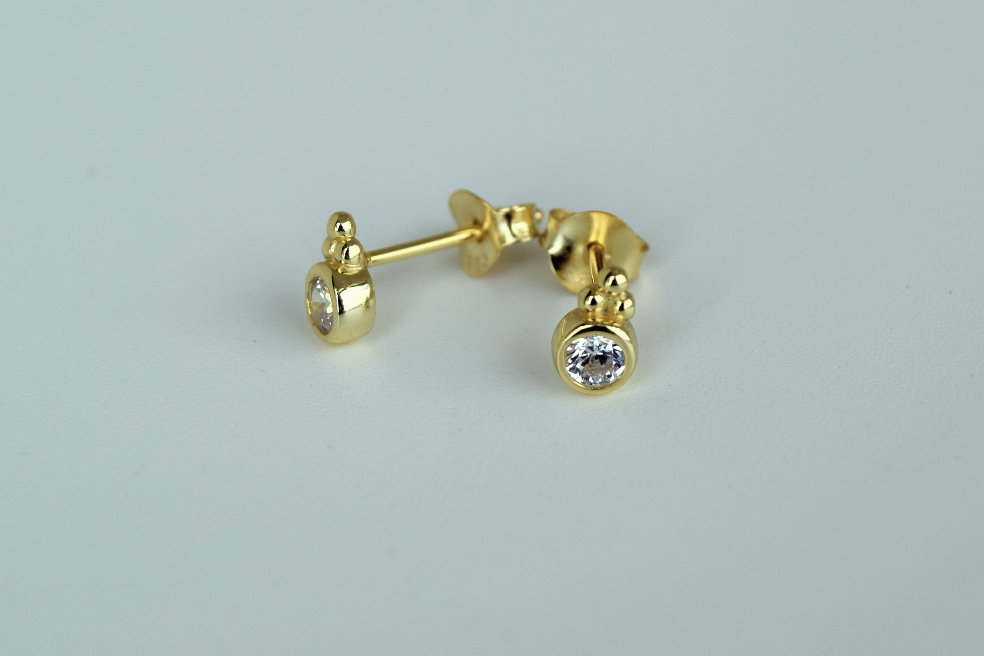 Delicate and stylish, these Gold Plated Stud Earrings feature a sparkling CZ crystal accompanied by three polished gold balls. Perfect for everyday wear or adding a subtle touch of shimmer to any outfit.