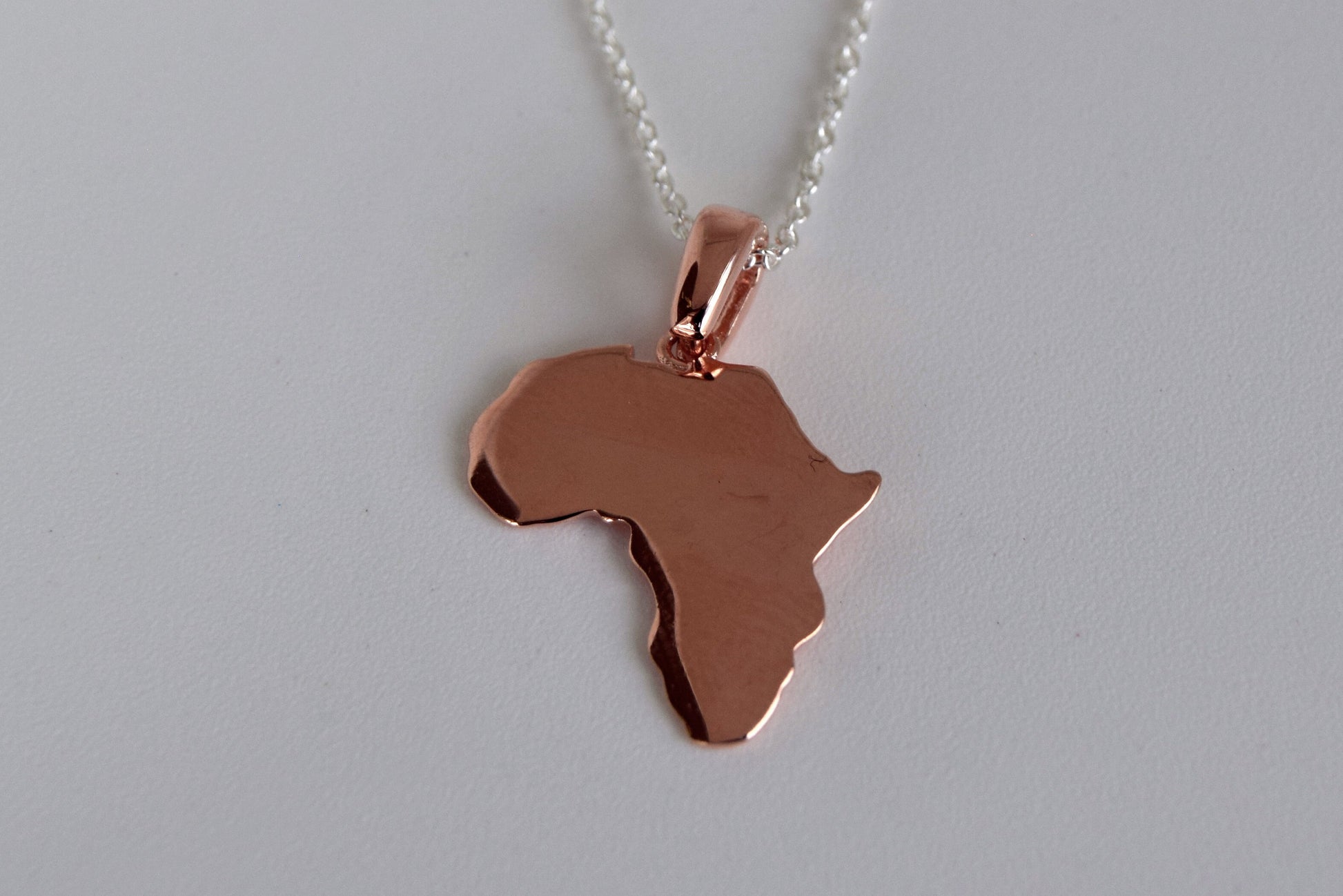Make a statement with this bold Rose Gold Necklace, featuring a polished Africa-shaped pendant. Perfect for showcasing style and heritage, whether worn alone or layered with other pieces.
