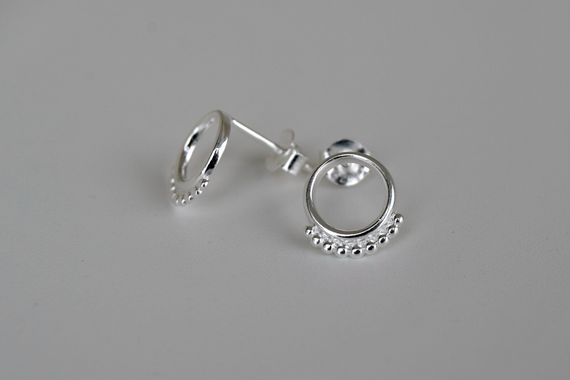 Delicate and modern, these Sterling Silver Stud Earrings feature an open circle accented with tiny silver balls for a subtle, textured finish. Perfect for everyday wear or pairing with other minimalist pieces.