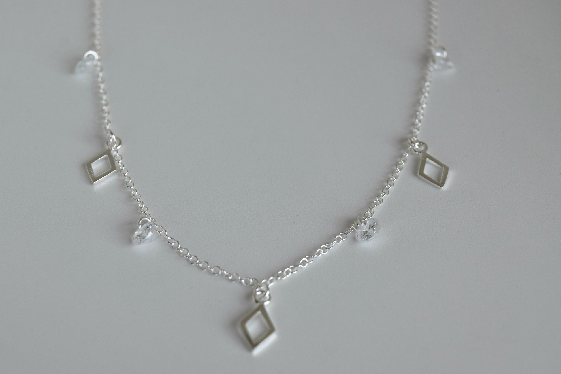 Sterling Silver Multi Open Diamond Shape Pendant And CZ Necklace