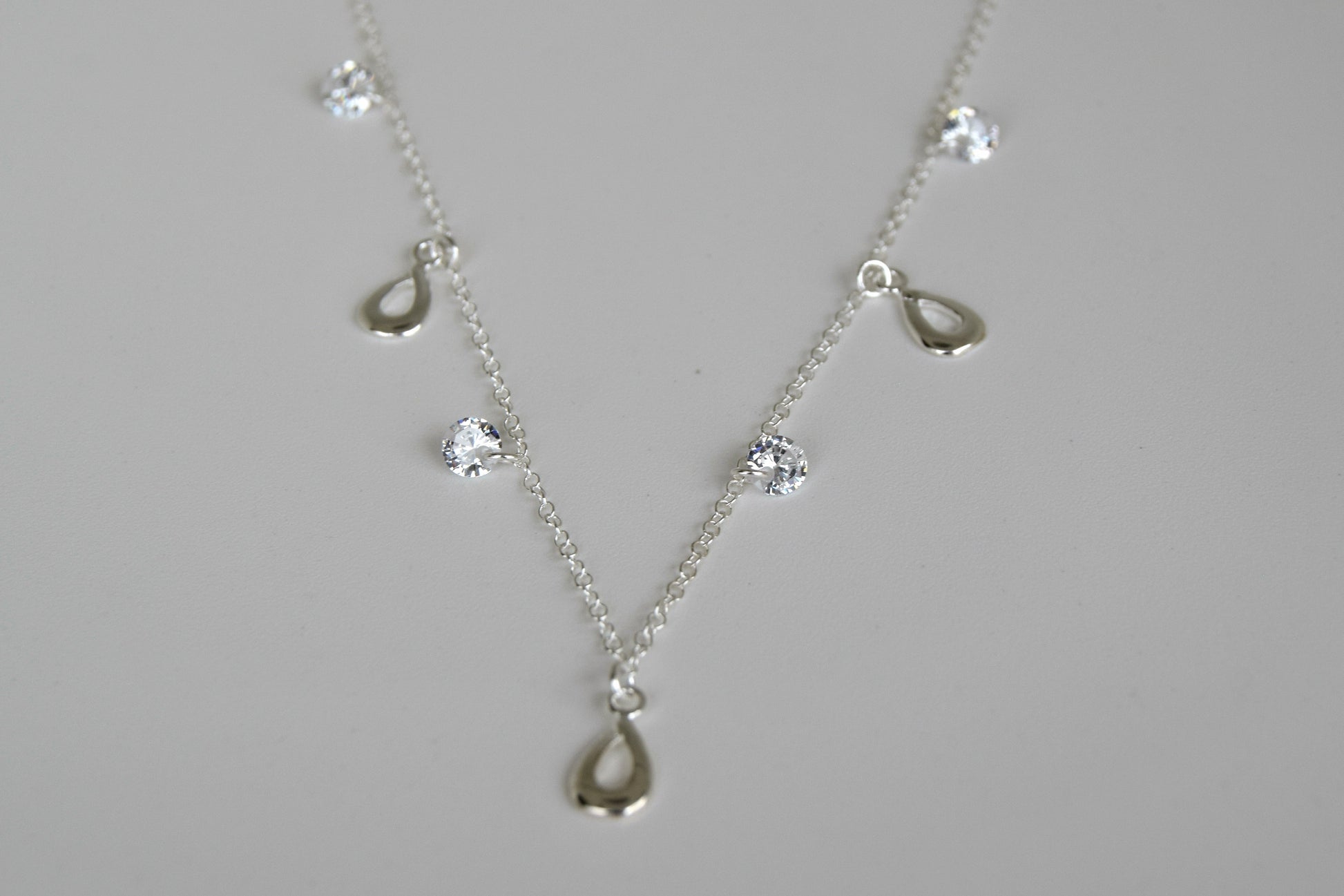 Elegant and textured, this Sterling-Silver Necklace features multiple teardrop charms combined with sparkling stones for a layered, eye-catching design. Perfect for layering or wearing alone to add subtle sophistication to any outfit.